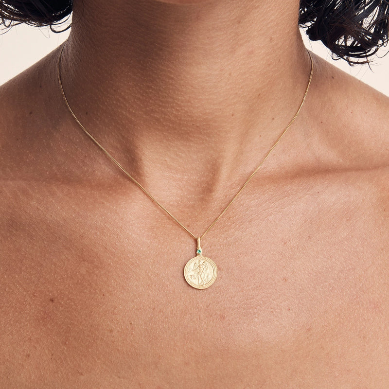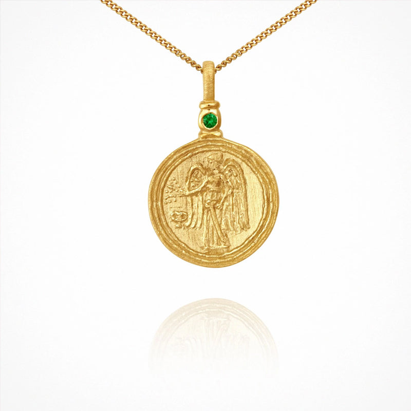 The Serafina Coin Necklace in 18K Gold Vermeil is a small coin pendant depicting a Guardian Angel in an aged, antique aesthetic. A small round Emerald sits atop the coin pendant, representing love, compassion and healing. The Serafina Coin Necklace Gold bestows love and protection upon the wearer.