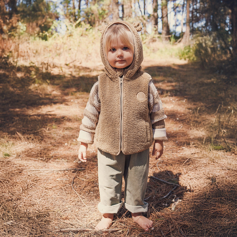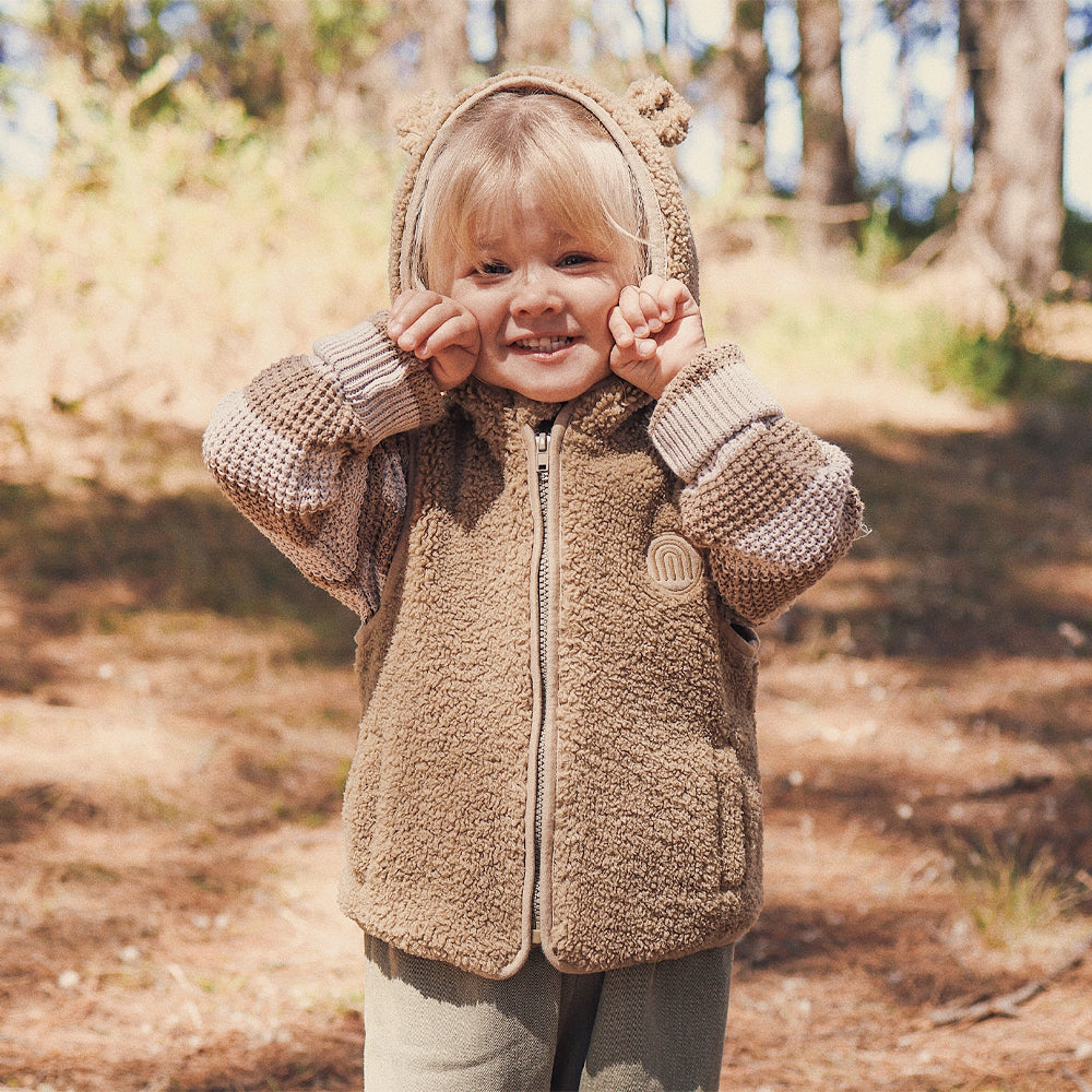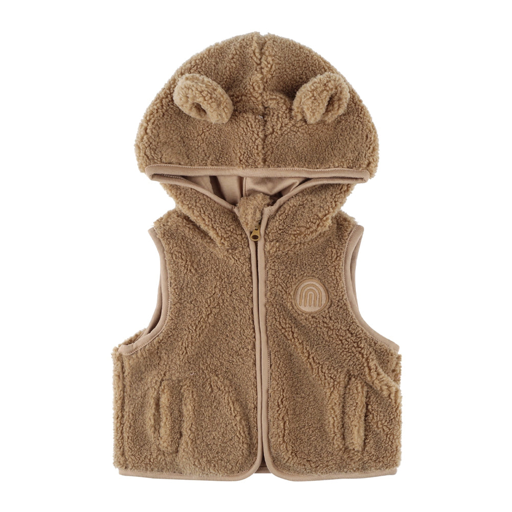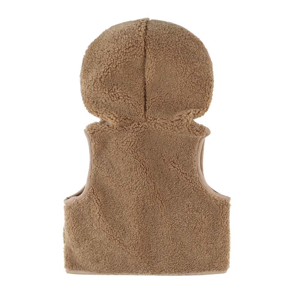 Crafted in soft teddy fur, the mocha Sherpa Vest features sweet matching teddy ears on its cosy hood.