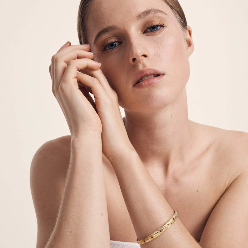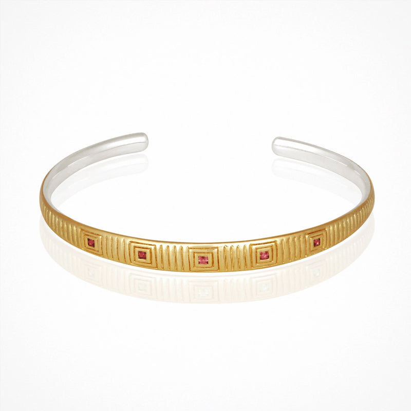 The Sila Cuff in Polished 18K Gold Vermeil features engraving inspired by our love of Ancient Grecian ceramics. The five brilliant square cut Rhodolite gemstones are known to alleviate feelings of inadequacy and inspire feelings of confidence and self-worth. The Sila Cuff is a modern interpretation of ancient design techniques that speaks to strength and balance.