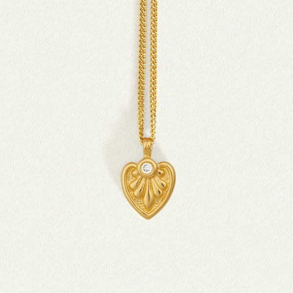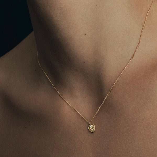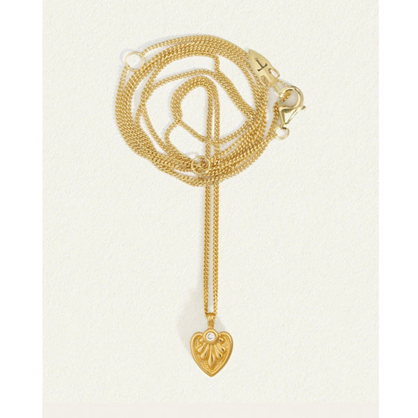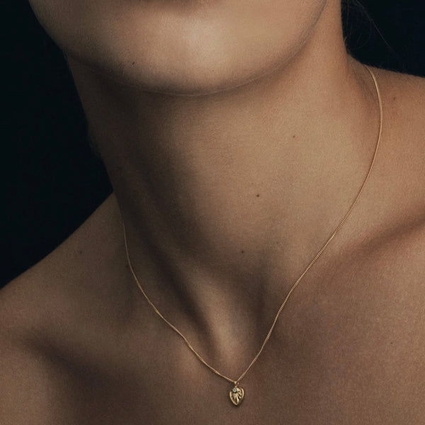 The Silph Necklace features a small detailed heart-shaped pendant suspended from a fine curb chain. This stunning 18K gold vermeil necklace is adorned with a round-brilliant lab diamond - a universal symbol of eternal love.