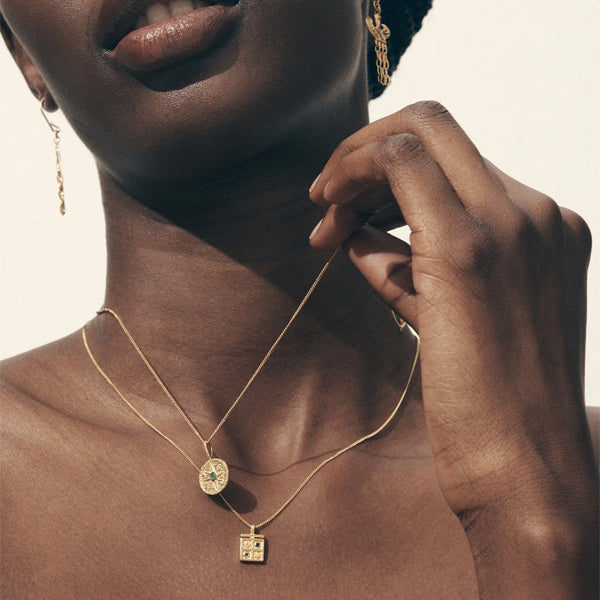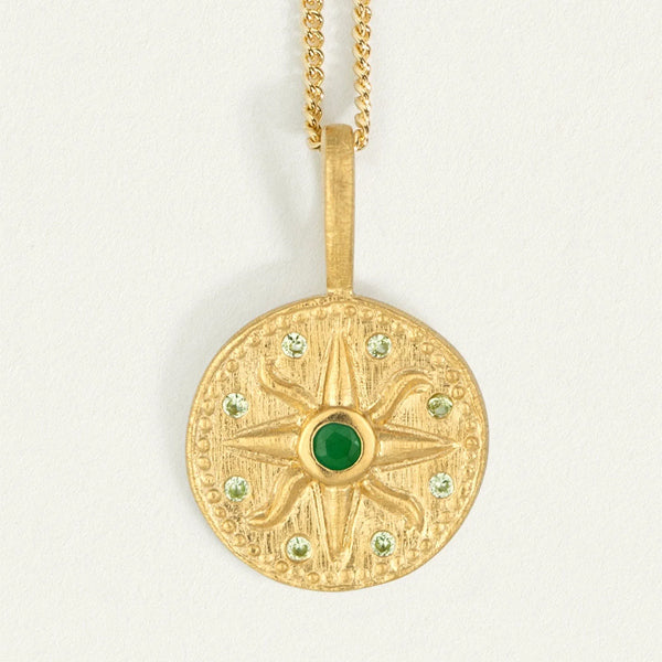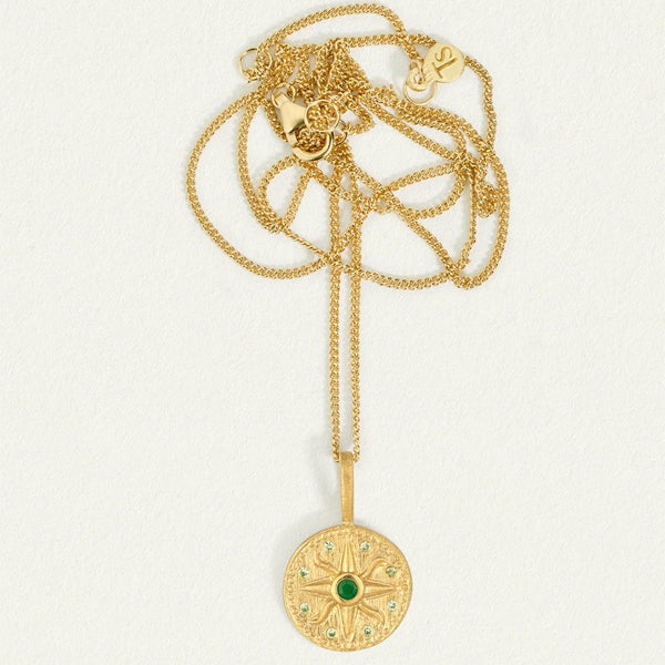 The Solana Necklace, in 18k gold vermeil, is a vibrant coin necklace embossed with a golden sunburst that transports us to Mediterranean summers.