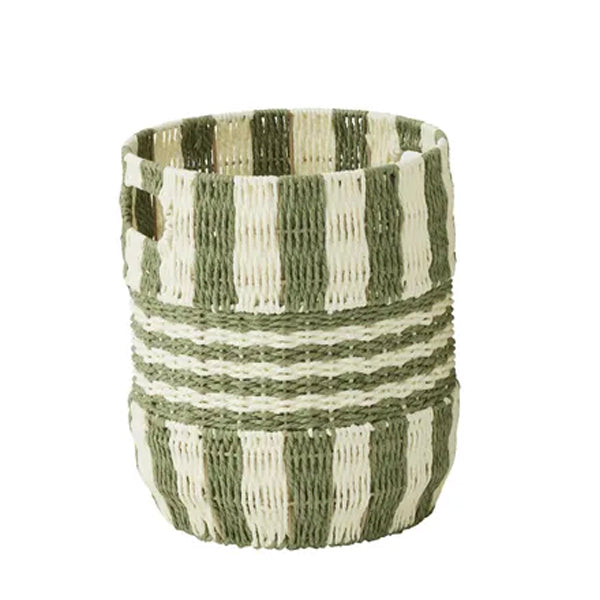 Rattan baskets are ideal for adding colour and texture into any space. The Solana Basket features thick olive green and cream stripes running vertically, broken up by thinner stripes running horizontally, and open handles.