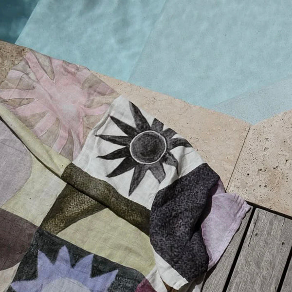 In a collaboration between Milky Designs and talented Newcastle artist Annie Everingham, comes the Sun Checkers Wrap - a fun but elegant eye-catching design. A shared love for colour and texture, the grace of nature's blooms, and the soothing embrace of the seaside inspired this hand painted textile design created from a mixture of watercolour and acrylic.