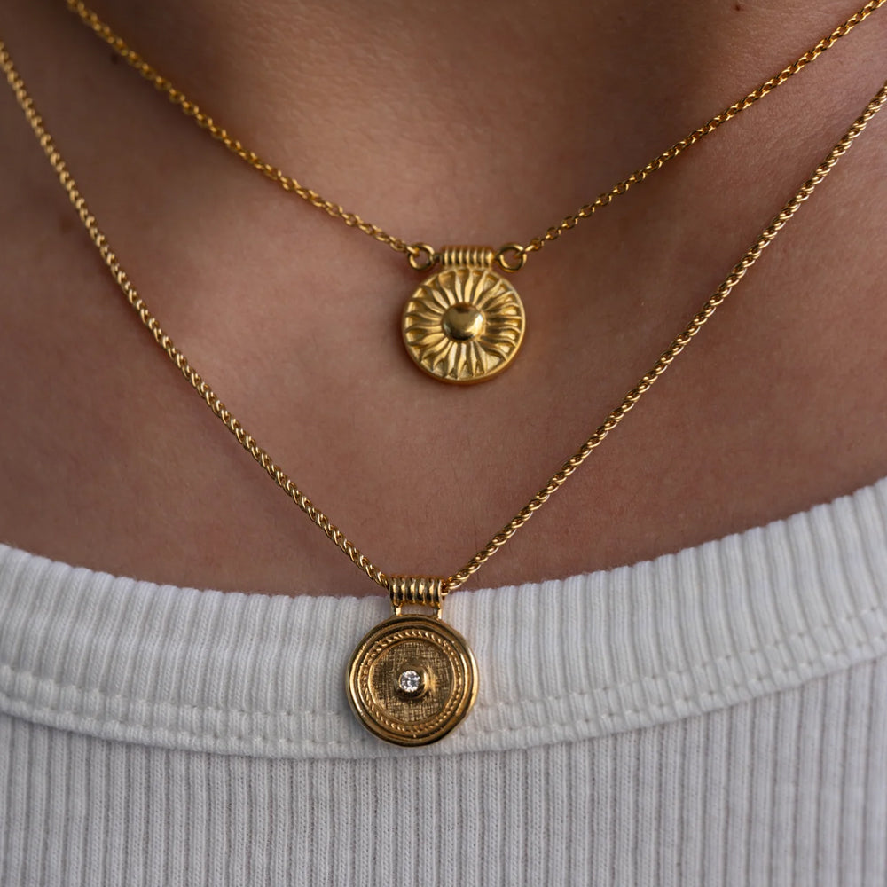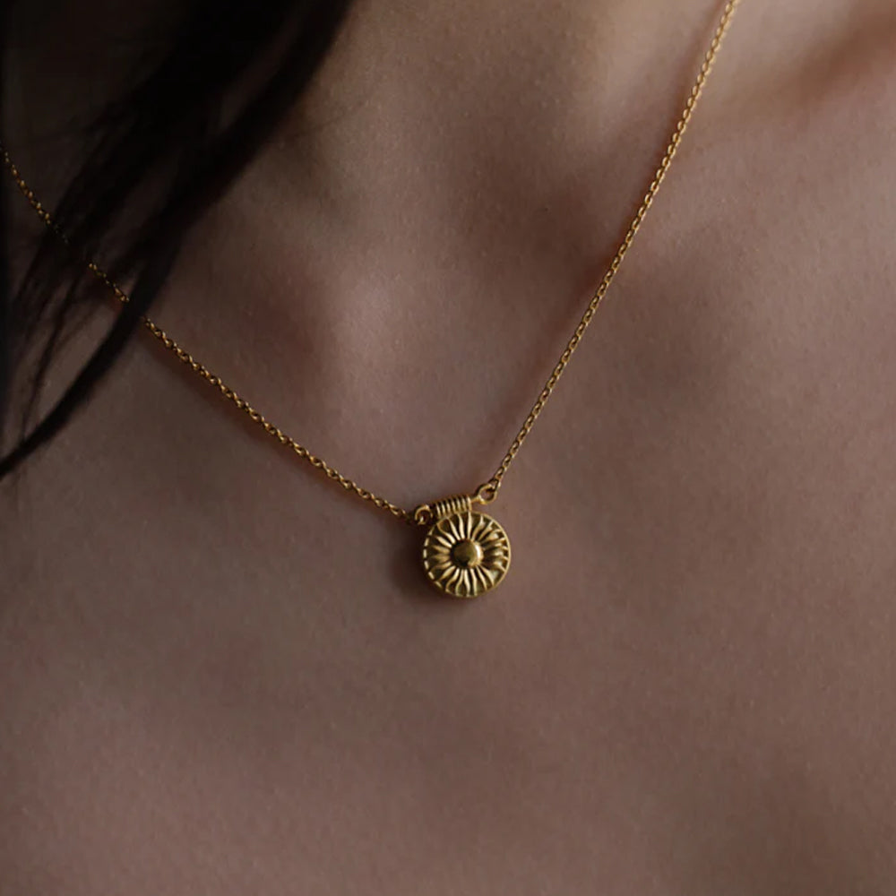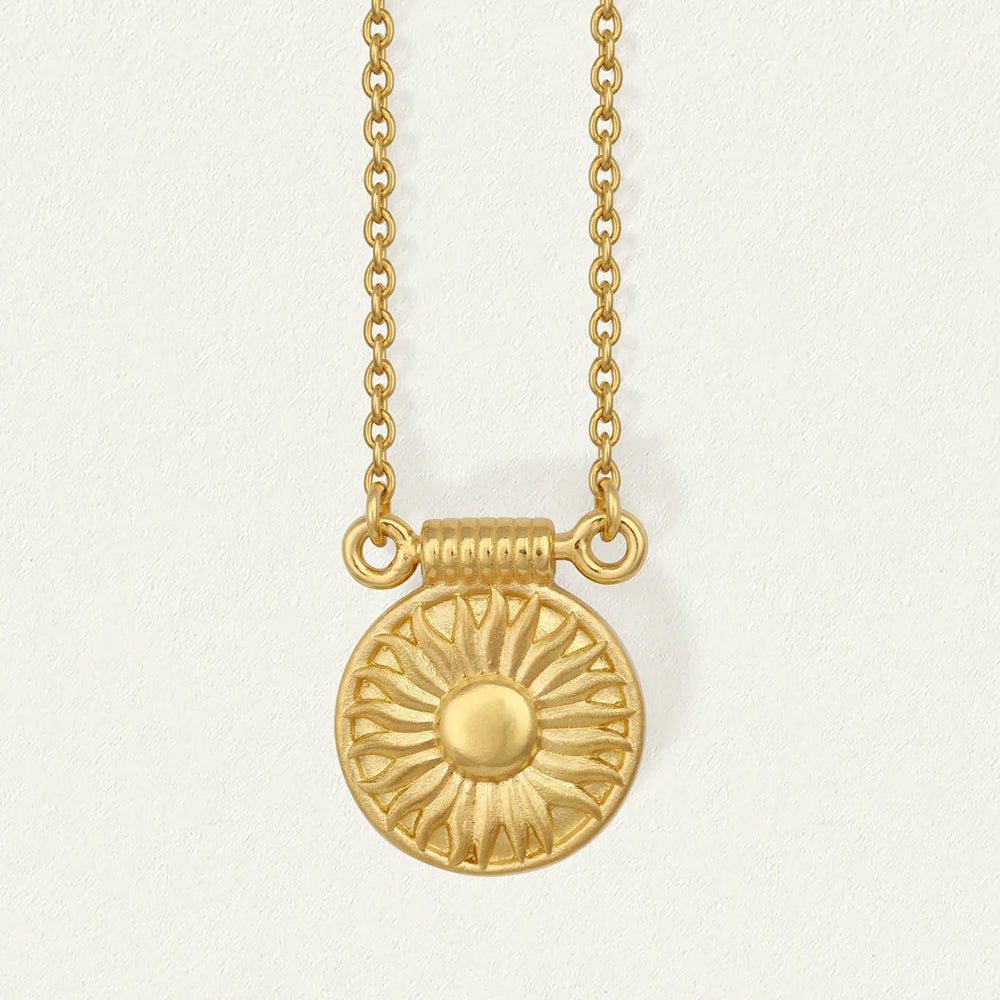 Crafted from 18k gold vermeil, the stunning Sunny Necklace features a sun pendant suspended from a cable chain. The radiating sun motif is an archetypal symbol representing life, power, and divine energy.
