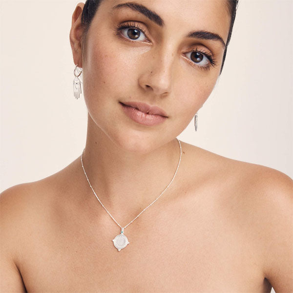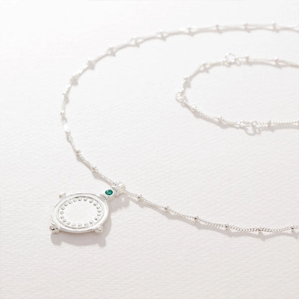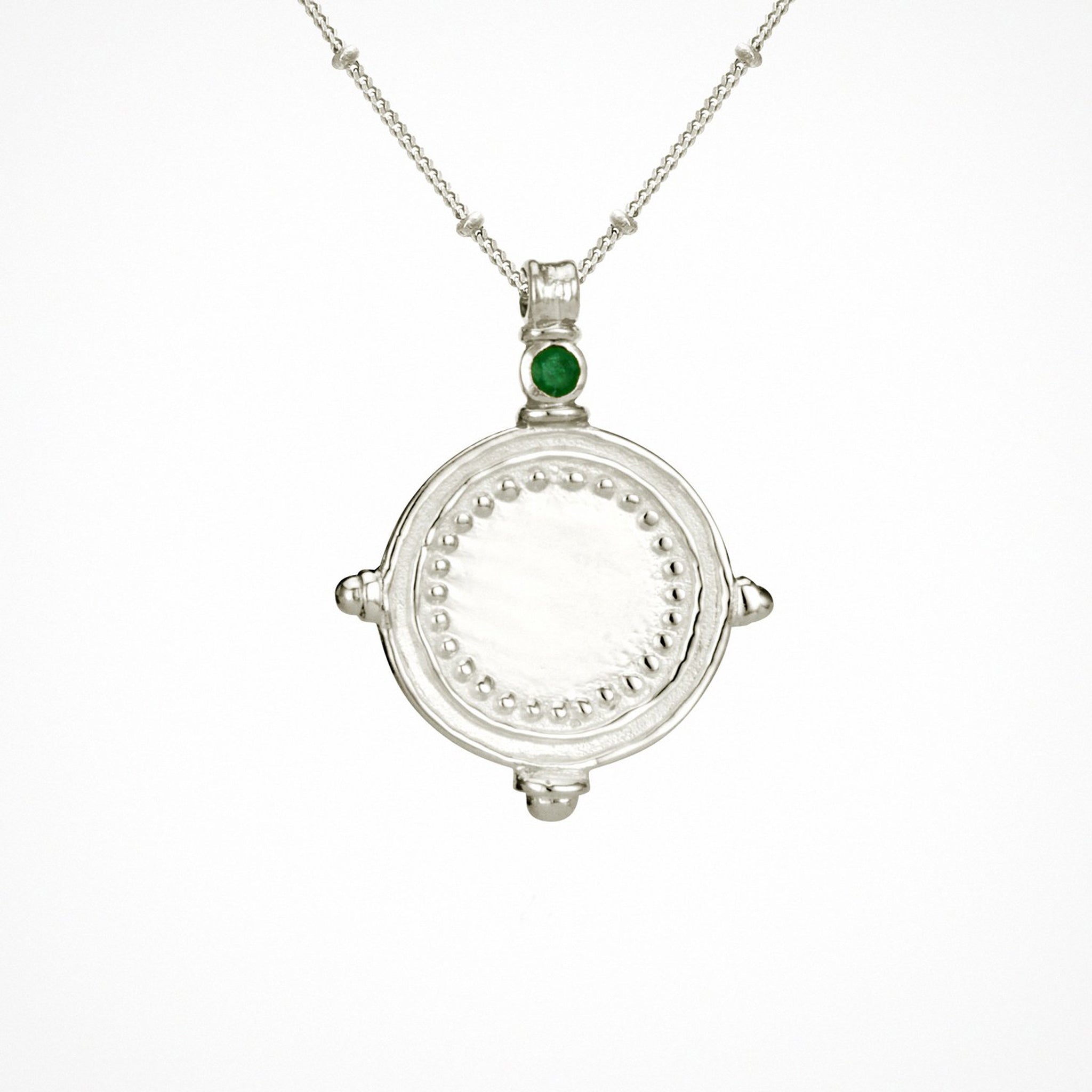 The Sura Necklace in cross-brushed silver is reminiscent of an ancient coin with its symmetric hand brushed embossed dotted detailing and circular shape, a faceted oval emerald at the tip of 4 symmetrical points completes the design on a fine chain with delicate gold bead detailing.