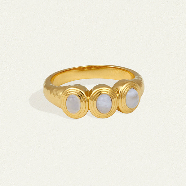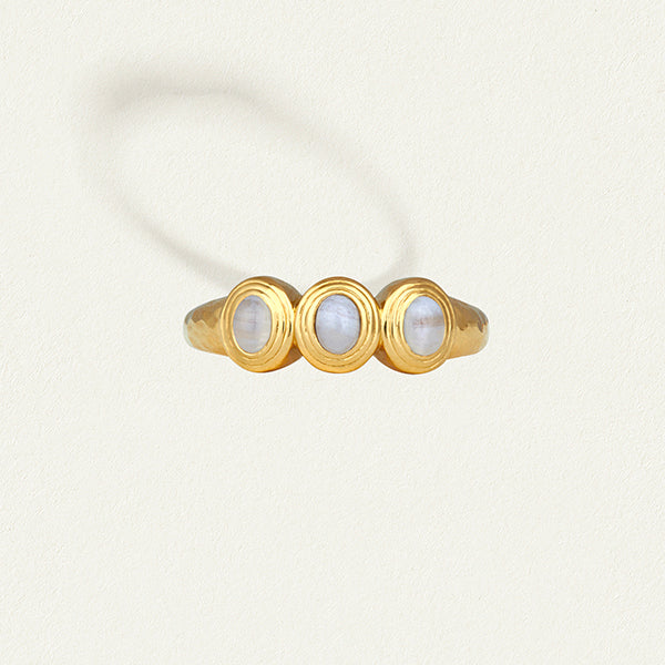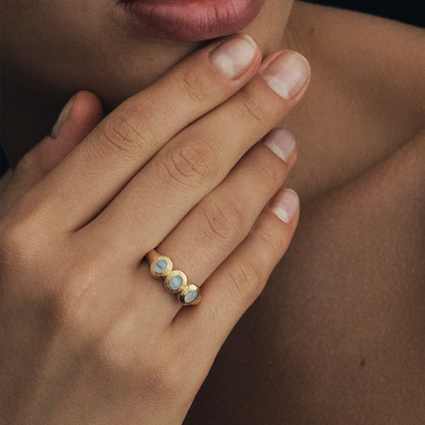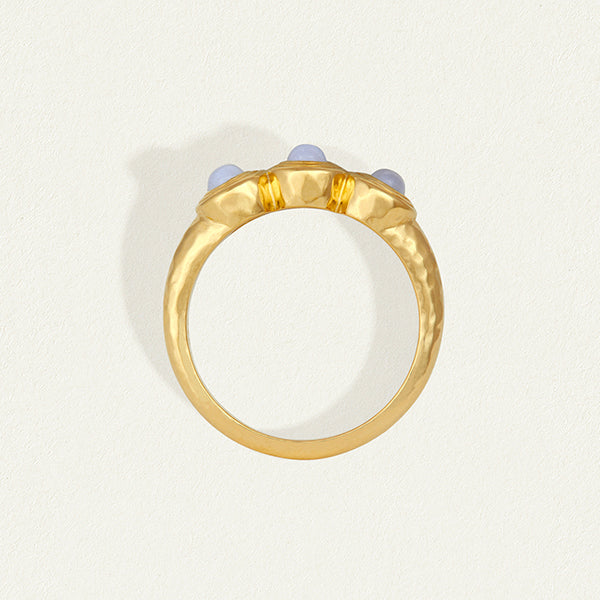 Crafted from 18k gold vermeil, the Talis Trilogy Ring features three bezel-set cabochons. Blue lace agate, known for its soft blue and white banding, is historically linked with tranquility and emotional balance.