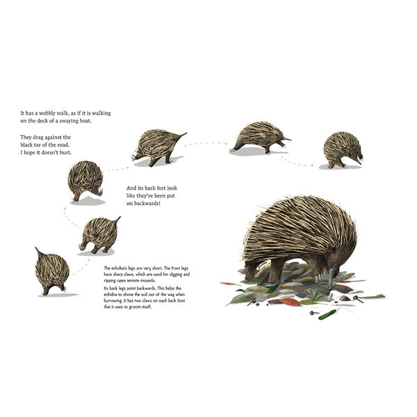 As a young child and their nana go for walks together, they follow a short-beaked echidna keenly observing and discussing what its life might be life. Learn with them about what echidnas eat, where they live, and how they protect themselves.
