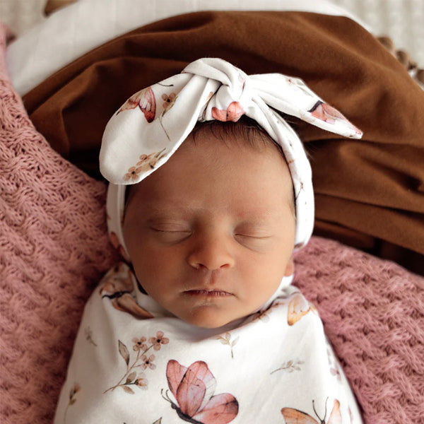 This super sweet, organic cotton Butterfly Topknot Headband makes a perfect gift for new bub, and pairs beautifully with the matching Muslin Wrap (sold separately).