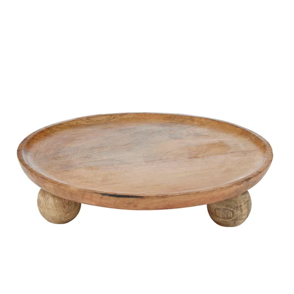 The Vance Round Board features a shallow lipped tray resting on three wooden spheres, all showcasing beautiful natural timber grains and markings. Ideal for serving food, or anchoring pieces on a table or console.