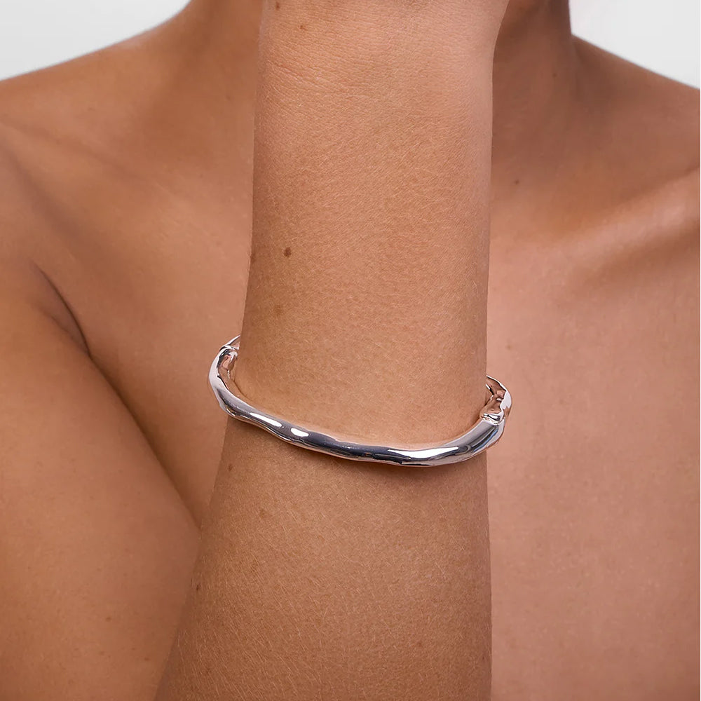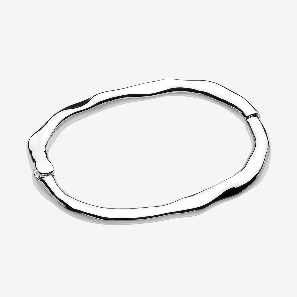 The Verity Silver Hinge Bangle features an organic oval shape with a smooth molten appearance. Hinged with clasp closure for easy wear.