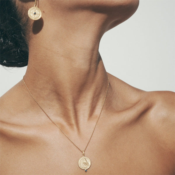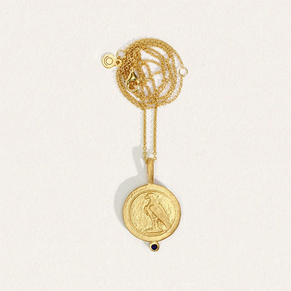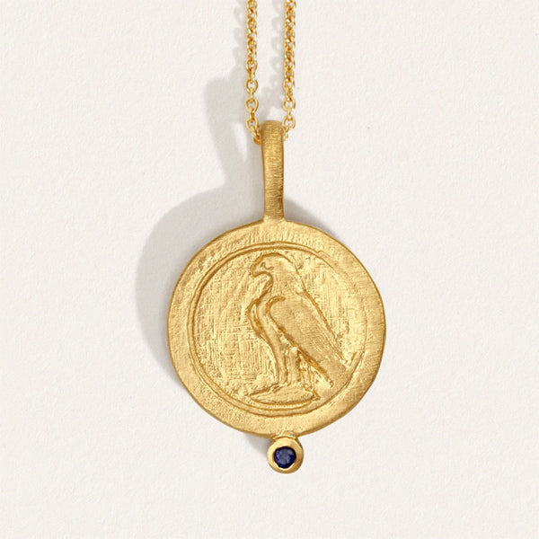 The Virago Coin Necklace in 18k gold vermeil depicts a lovingly carved eagle perched atop a round sapphire. A cable chain complements the weathered surface of the coin pendant conveying depth of character.