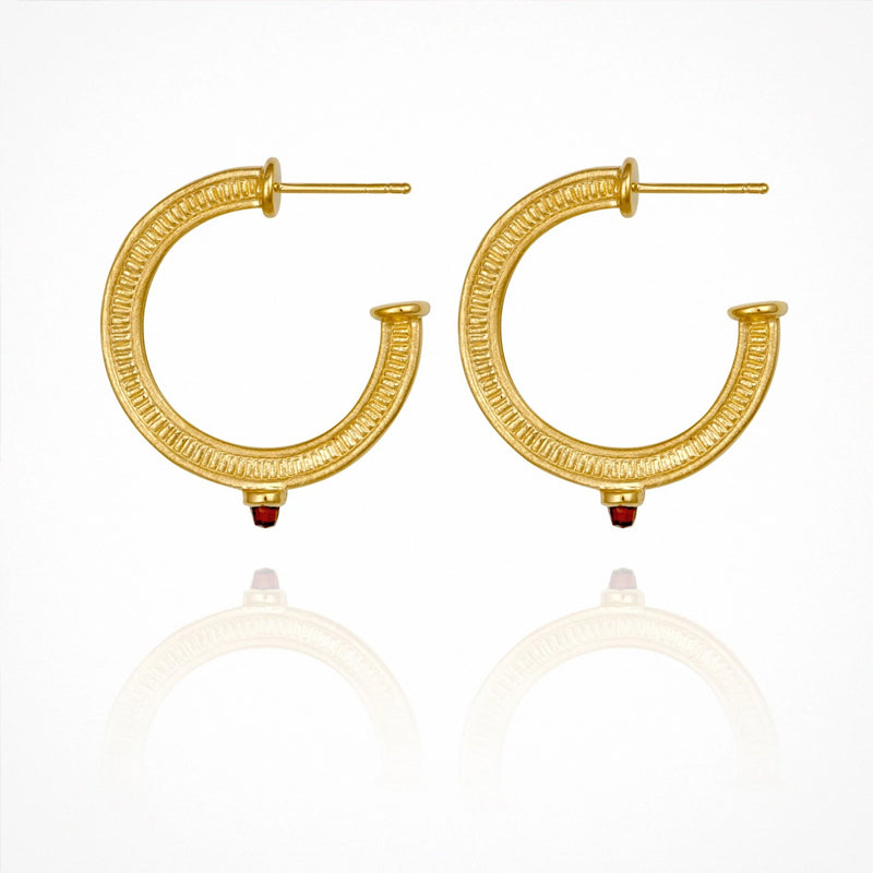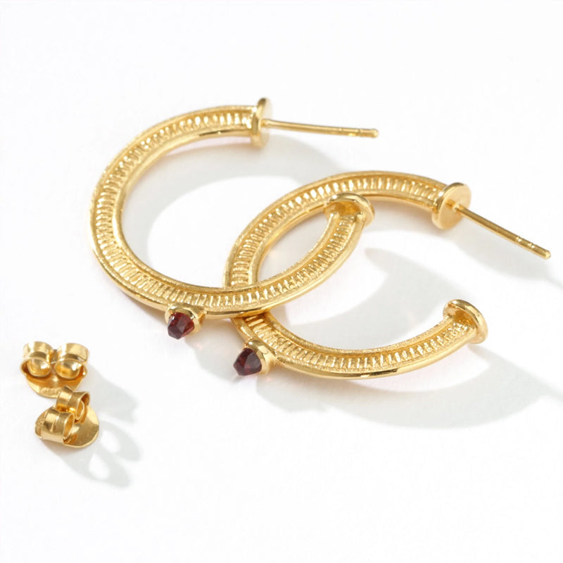 The Vulcan Hoop Earrings in 18K Gold Vermeil are a textured hoop created using a contrasting polished and cross brushed finish, punctuated by custom bullet cut Garnets. Named after the ancient Roman God of fire, Vulcan, the Garnet details are representative of a flame and speak to passion, creativity and strength. The Vulcan Hoop Earrings are a striking interpretation of an everyday classic.