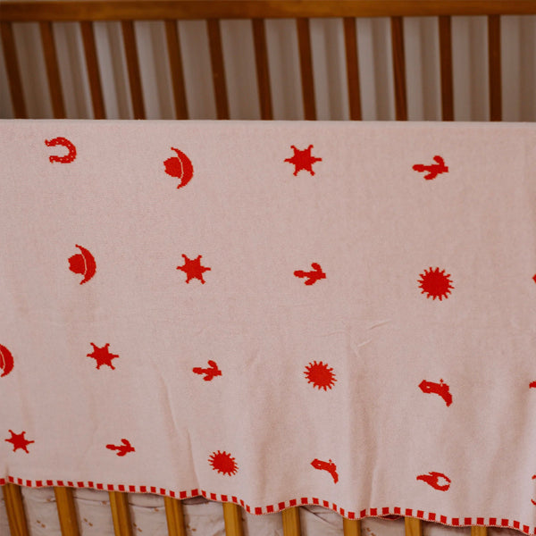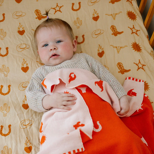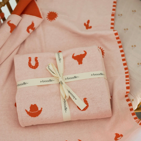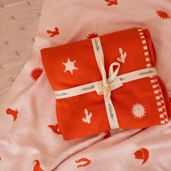 Cowboy core at its cutest. The reversible Wild West Blanket by The Bundle Co features sweet western motifs in a striking orange and peach palette, with a block stripe border.